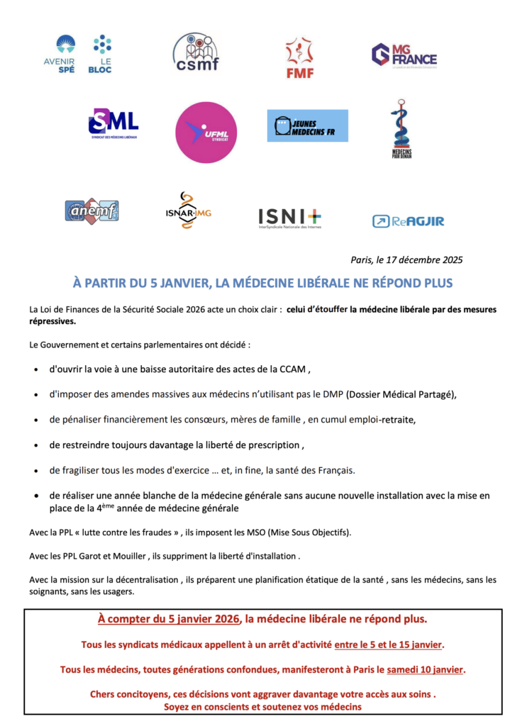Communiqué intersyndical : A partir du 5 janvier, la médecine libérale ne répond plus