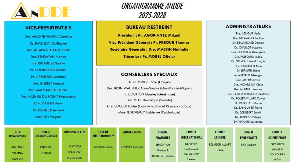 * L’équipe dirigeante de l’ANDDE pour les 3 prochaines années sera menée par le Pr. Mikaël Agopiantz, gynécologue coordonnateur du Centre AMP du CHRU de Nancy, le Pr. Thomas Fréour, biologiste responsable du Centre AMP du CHU de Nantes, la Dre. Nathalie Massin, médecin coordinatrice du Centre AMP de l’Hôpital américain de Paris, le Pr. Olivier Morel, Chef de pôle de Gynécologie-Obstétrique au CHRU de Nancy, de 12 Vice-Présidents et d’un Conseil d’Administration de 35 personnes, professionnels de l’AMP, médecins et pharmaciens, biologistes et cliniciens, des secteurs public et privé, auxquels s’adjoignent des universitaires issus des sciences sociales, ainsi que des patients experts.
